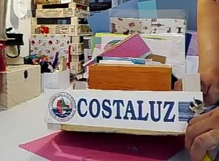También pegaremos los listones de madera que hemos obtenido de las cajas de fresas, los 4 laterales de la caja pequeña van en la parte superior como se muestra en esta foto.