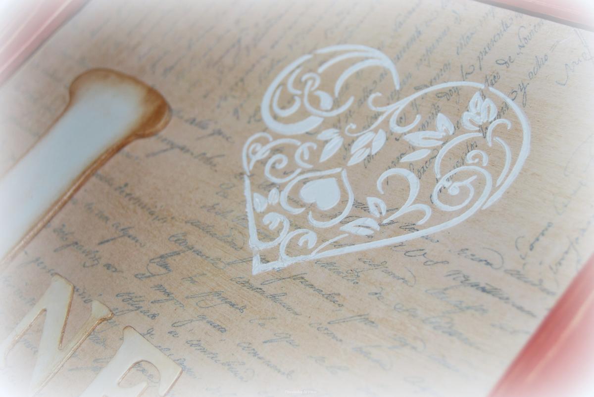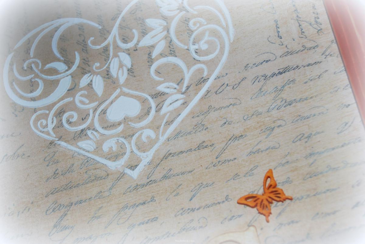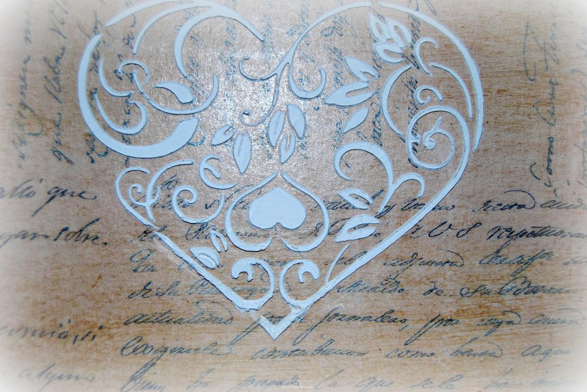 Corazón en relieve, realizado con pasta decorativa en color blanco, así destaca sobre el papel para decoupage añejo.