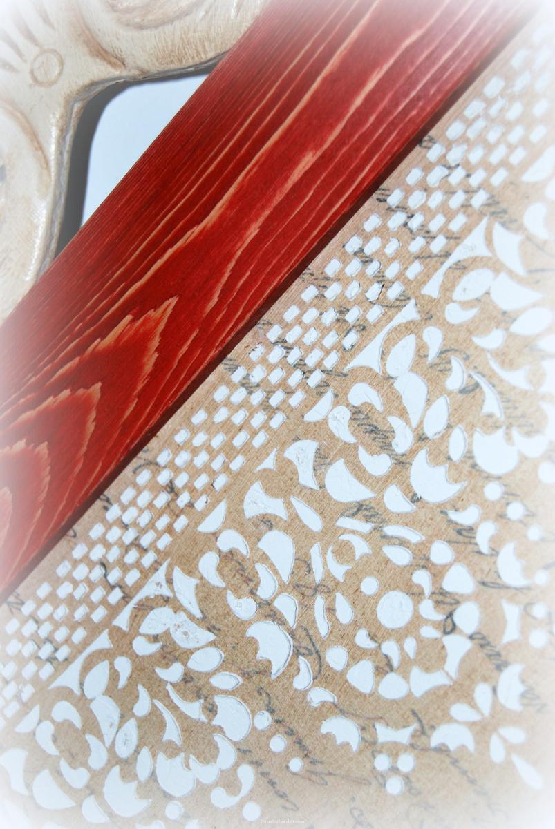 Papel para decoupage, letras en madera, copetes y pasta para relieve son los elementos mas importantes utilizados.