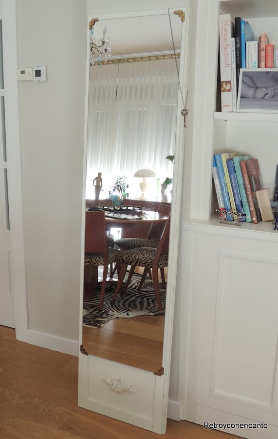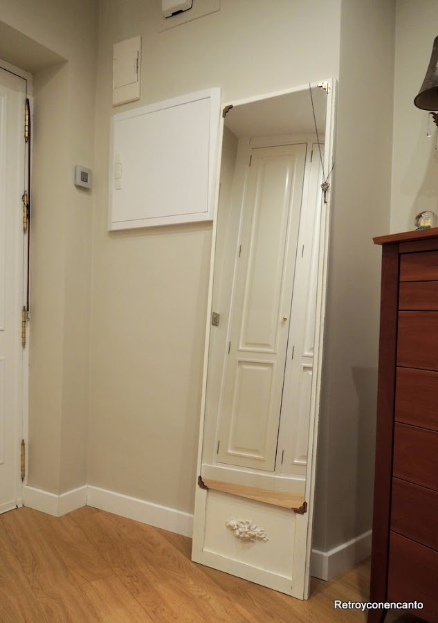 Ésta es la pared del horror de la entrada de una de nosotras. No será que no hemos hecho cubrecontadores... ¡Pero éste es especialmente enorme!... Por encima, aparece otra tapa pequeña de no sabemos qué otro tema eléctrico. Y para completar el cuadro, el timbre... ¿¿Cómo se camufla TODO esto?? Menos mal que el espejo encaja en el hueco a la perfección. Y toda la familia está feliz de poder echarse un último vistazo al salir de casa.
