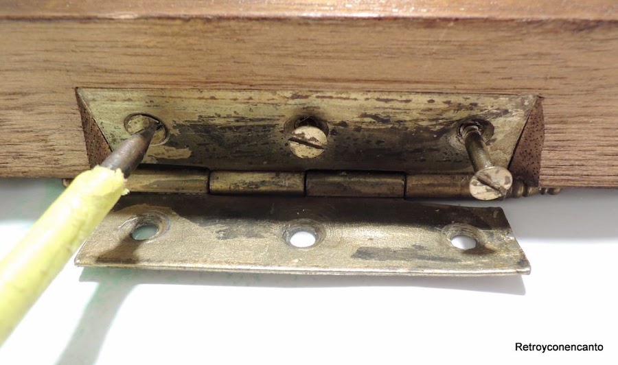 ¿Os acordáis de la preciosa puerta de armario que ya adorna uno de nuestros dormitorios? La de hoy no es tan bonita, pero era perfecta por su tamaño para una de nuestras entradas. Y bueno, ya sabéis lo que una mano de pintura y algún que otro detalle pueden lograr... Desmontamos las bisagras...