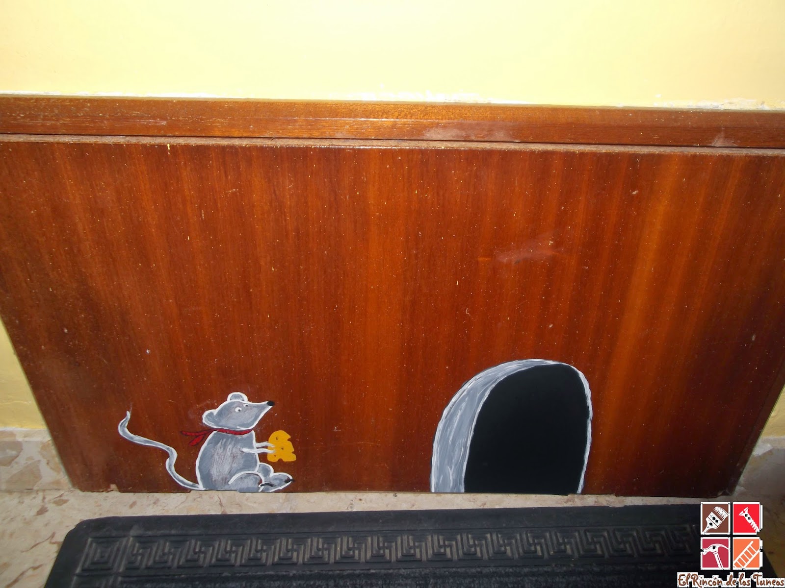 El resultado quedó muy bonito aunque hay que tener paciencia, si no deseáis complicaros con tela también podéis utilizar papel adhesivo o simplemente pintándolo.La puerta que esconde las llaves de paso del agua estaba barnizada y no quise tocarla, pero para darle un aire un poco más gracioso, dibujé a mano un pequeño ratón. Utilicé pinturas acrílicas y pinceles finos.