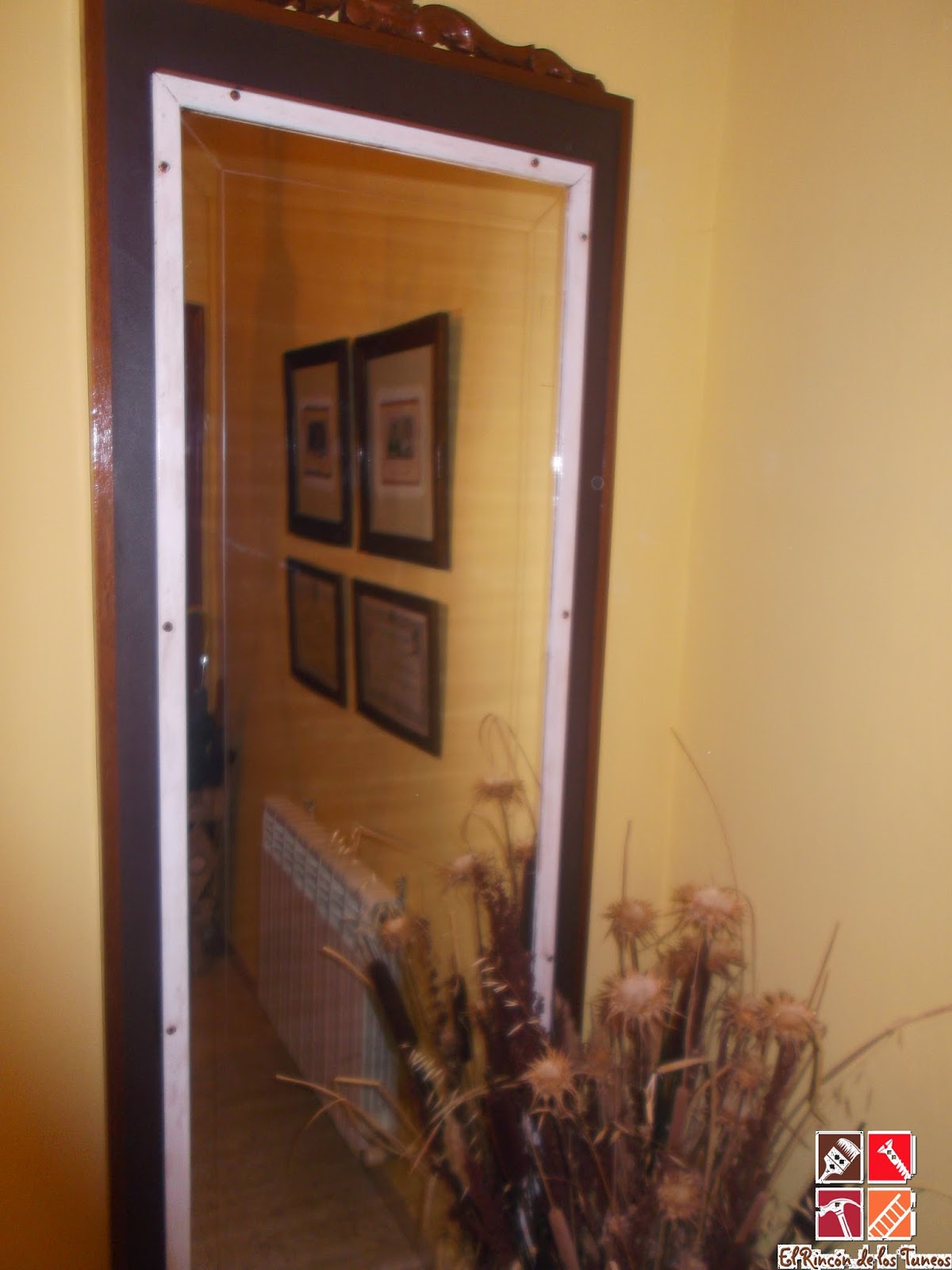- Para el recuadro interior pinté con esmalte blanco roto envejeciéndolo un poco con betún de judea y pintando los tornillos con marrón oscuro para resaltarlos.