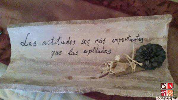 La he pintado en dos tonos, color veis claro, dos manos y luego en las imperfecciones de la teja le he dado un marrón oscuro, mezclándolo con el veis y estirando con el pincel para hacer un efecto envejecido a la teja. Luego la frase la he escrito a lápiz primeramente y después con un pincel muy fino la he repasado con pintura negra. El acabado como siempre con barniz spray mate. Y Lista para decorar: