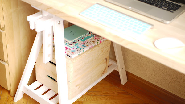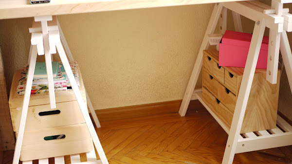 El caso, que llevaba un montón de tiempo imaginándome un escritorio de caballetes blancos y un tablero gigante de madera y cuando lo encontré en su web me volví loca y tuve que ponerme en contacto con ellos. Hablamos un poco del diseño y al final acordamos hacerlo con un par de caballetes, un tablero corrido sobre la cómoda y un montón de cajitas de madera bonitas para el almacenaje.