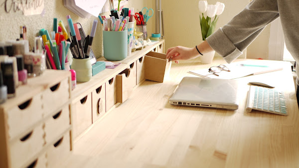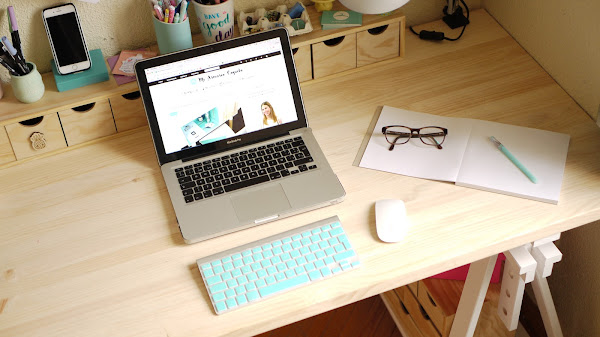 Además del ordenador, tengo espacio suficiente para poner otras cajoneras de madera muy estrechitas en las que guardo cosas que utilizo más a menudo: cargadores, cosas de papelería, ¡hasta utilizo uno como hucha! Y sobre ellos puedo poner un montón de tarritos para organizar bolis y rotus, dejar el móvil, un espacio para apuntar mis notas, ....
