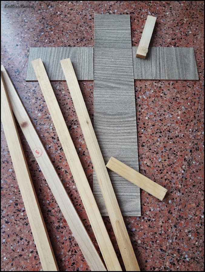 También tenía éstas maderitas finas de DM, y con la combinación de los listones de arriba y esto, se me ocurrió que podría hacer una cruz en blanco y negro.