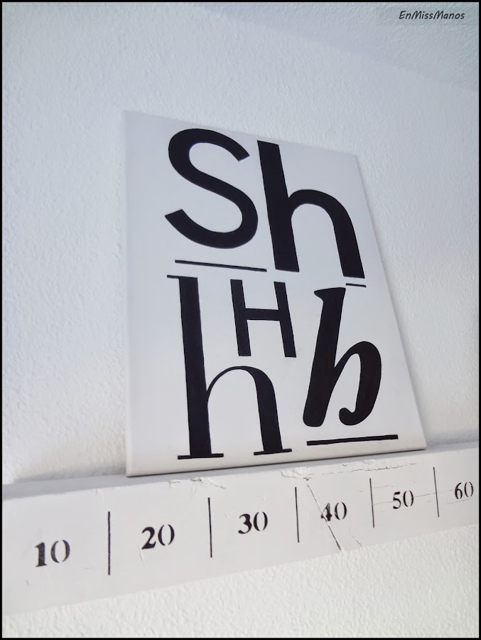 Y el otro cuadro de la habitación que al final sí que se ha quedado ahí es un lienzo que pinté gracias a una lámina muy nórdica y muy adecuada para la habitación, ya que invita al silencio con el "SHHH".