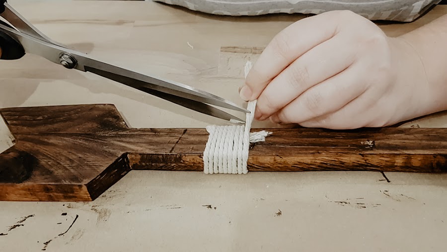 Y para terminar, le hemos añadido unos trozos de cuerda para que quede más bonita. Con la ayuda de una pistola de silicona caliente añadimos un poco en la parte trasera, apoyamos la cuerda y la empezamos a enrollar. Cuando la tengamos, cortamos el sobrante de la cuerda y la fijamos con otro punto de cola.