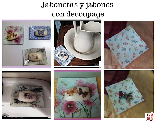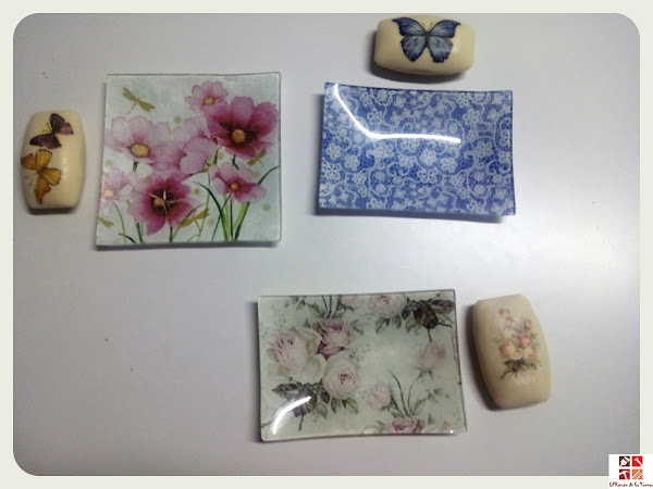La entrada de hoy es muy olorosa, se trata de hacer decoupage en cristal, y he elegido para ello unas jabonetas a juego con sus jabones, se las había visto a Helena de h3mmanualidades que además de leerlo en su blog he tenido el placer de verlas en persona, ya que coincidimos varias veces vendiendo en el mismo mercado, sin ir más lejos este domingo pasado estuvimos las dos en Espacio Open, y os puedo asegurar que hace cosas chulísimas, visitar su blog que es genial y super creativo.