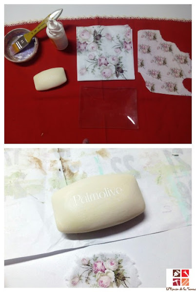 Con el jabón hago lo mismo, antes y como este jabón tiene la marca lo he lijado un poco para quitarle el relieve; hacer la misma operación, recortar el motivo de la servi que se quiere, separar las hojas y quedarse sólo con la del dibujo, pegar con cola decoupage, dejar secar y volver a darle con la misma cola decoupage a todo el jabón.