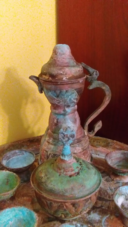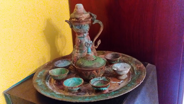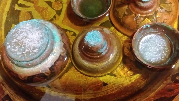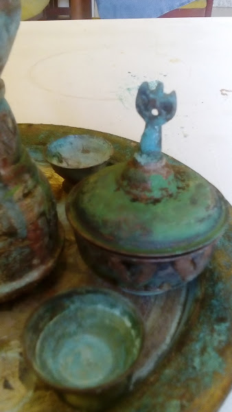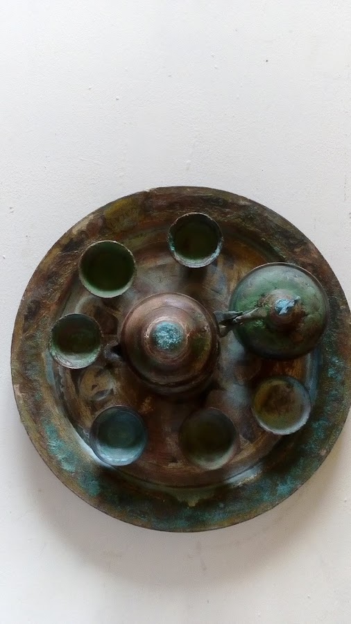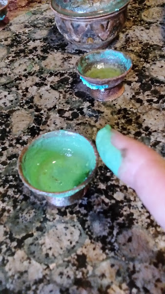 A las dos semanas aproximadamente, ya decidí sacarlos, y con esta calor el vinagre se había evaporado bastante, así que quedó esta especie de tintura esmeralda. Con el dedo lo estuve repasando todo para que quedara bien coloreado.Dejé secar el juego de té.
