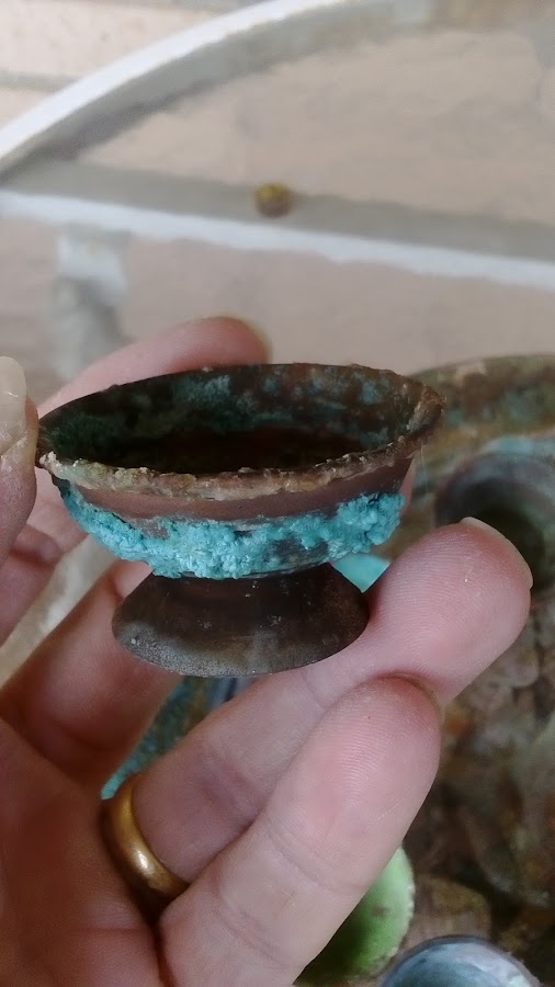 detalle de la sal posada en el metal, donde se aprecia más el verde