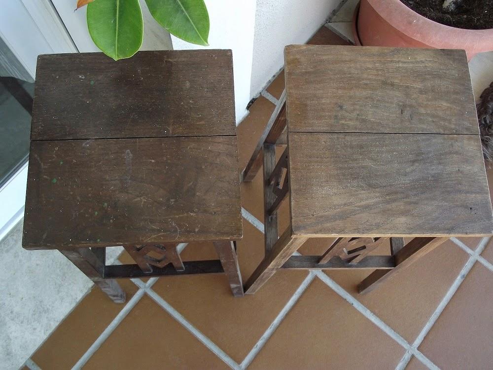 Para terminar una mano generosa de cera incolora, que protege la madera y le da un brillo satinado muy bonito. Al sobre además le di dos manos de barniz acrílico para reforzar la protección, puesto que se van a usar como mini-mesitas auxiliares. Y eso es todo.