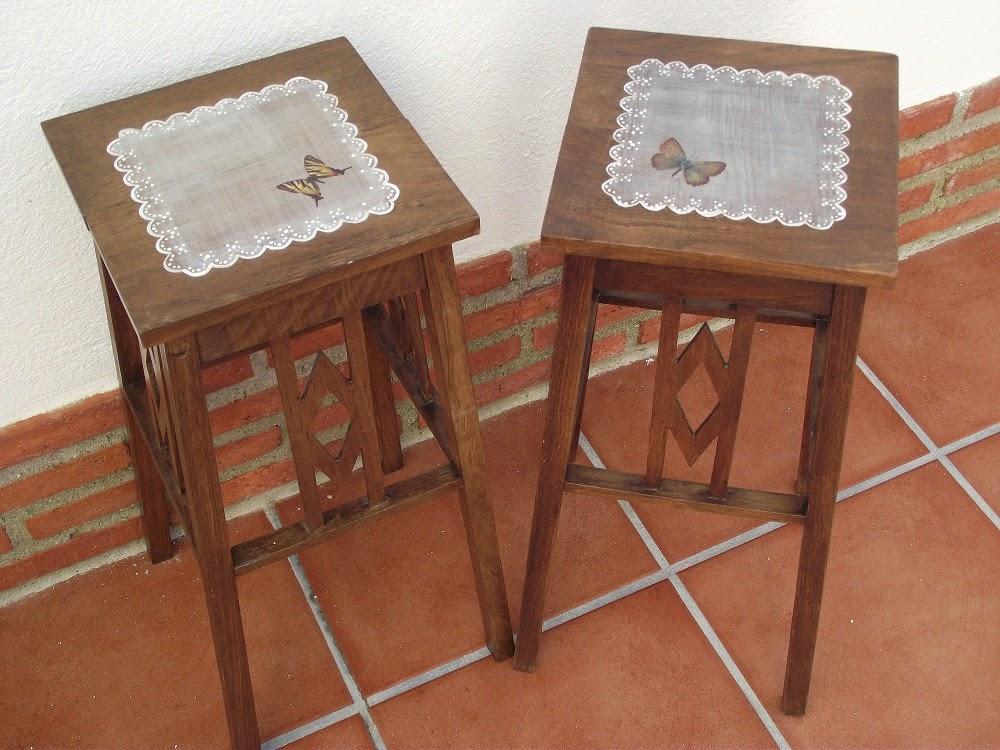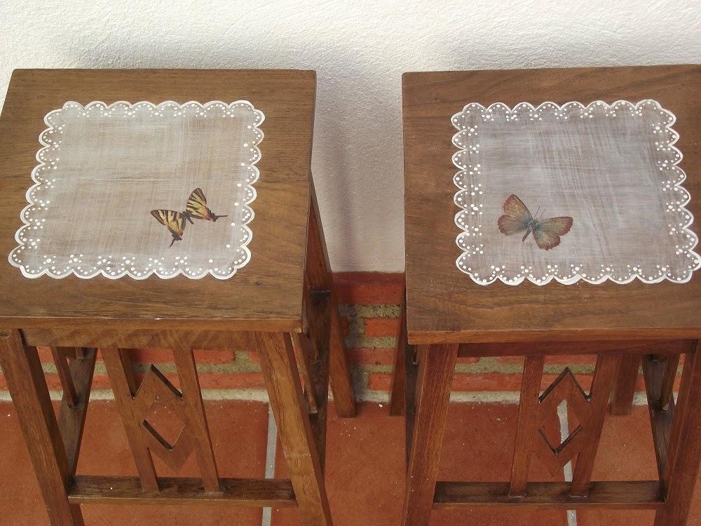 Estaban en muy buen estado, así es que únicamente les quité el barniz antiguo, que estaba muy cuarteado. Dos manos de tapaporos y ya están listos para decorarlos como mejor nos convenga, en este caso "bordando" un tapete de organza con dos mariposas de color.