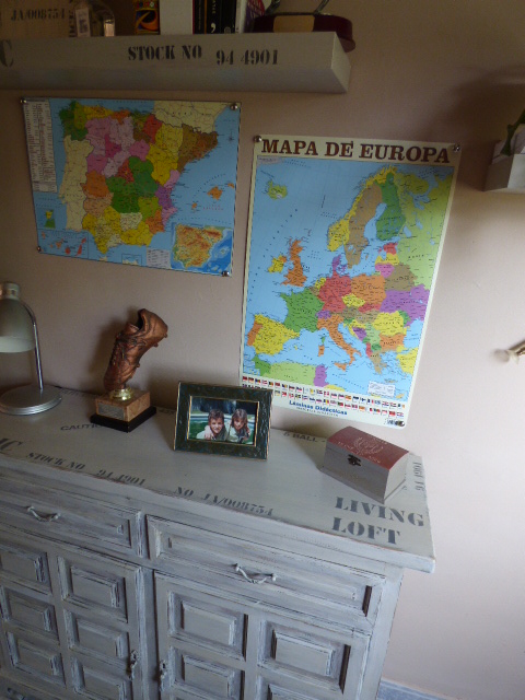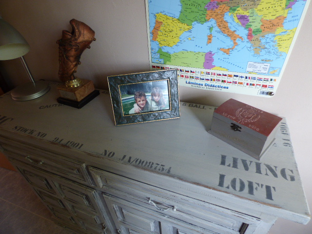 He visto muchos muebles castellanos tuneados y si hubiera sido para mí tengo claro que en cada cuarterón hubiera puesto una flor con decoupage.....pero siendo para mi hijo tenía que decorarlo acorde a él y además no podía hacerlo demasiado recargado.