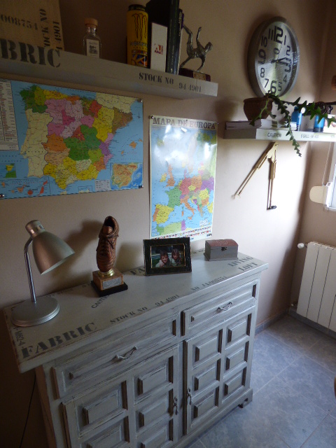 El caso es que para amueblársela tenía que apañarme con lo que había por casa y he recurrido a tunear un mueble castellano del año catapún y una mesita que tenía también por aquí.