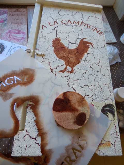 Con la misma Chalky avellana de Artis Decor, con la que hice primeramente el craquelado en la madera y esponjita, he ido estarciendo todos los motivos
