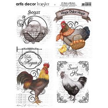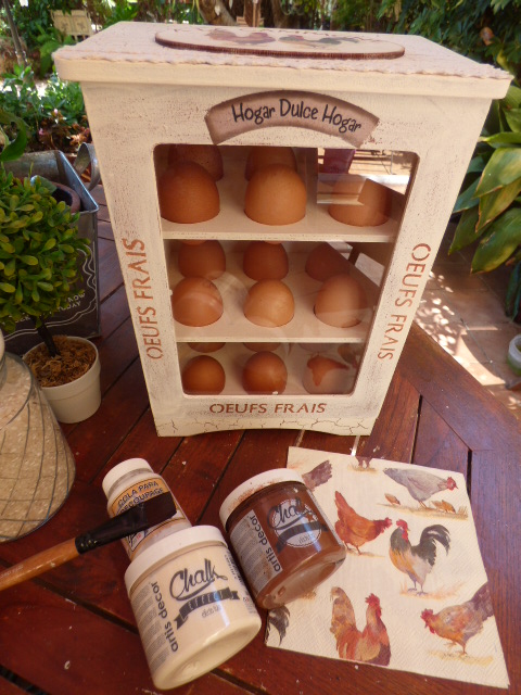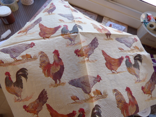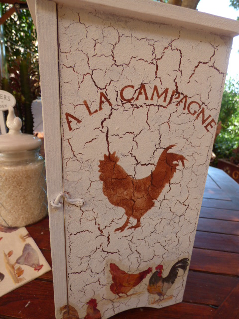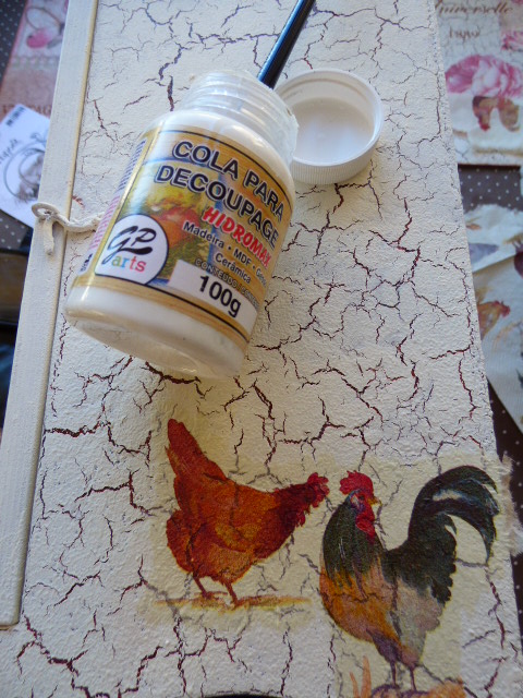 Unos recortes de gallos y gallinas para decorar los laterales, Los adhiero con esta cola decoupage que me encanta por ser espesita y secar súper rápido