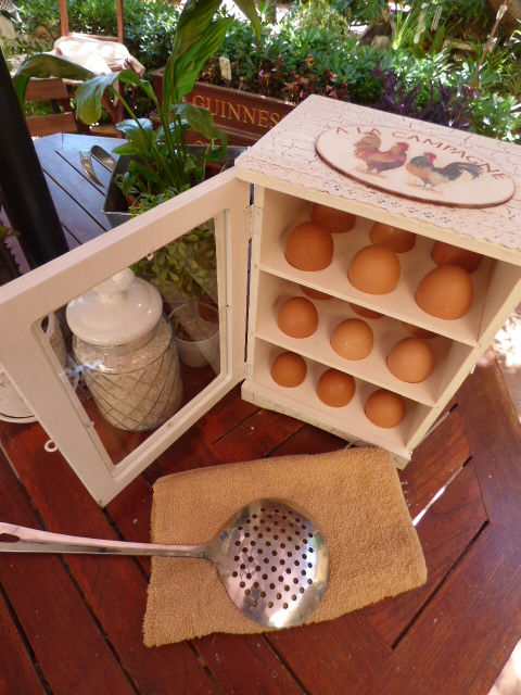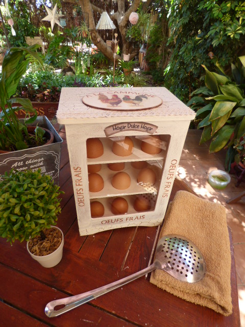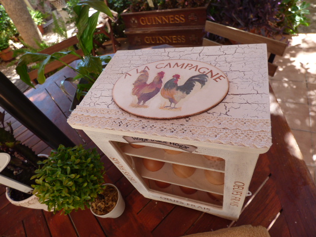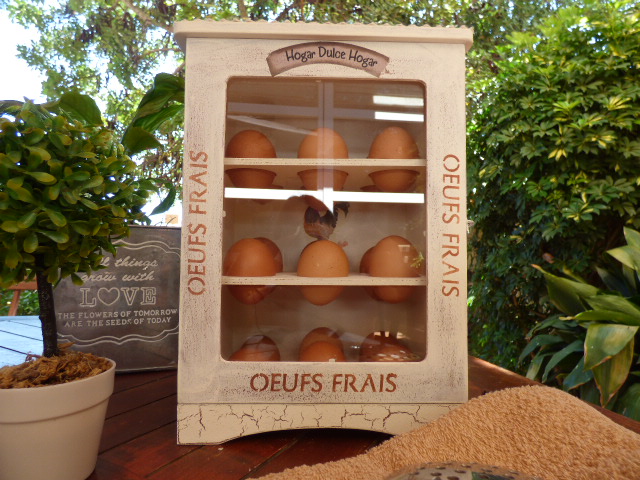 La he llenado de huevos recien puestos ayer por las gallinas de una de mis hermanas¡ Seguro que le encanta la huevera cuando la vea¡