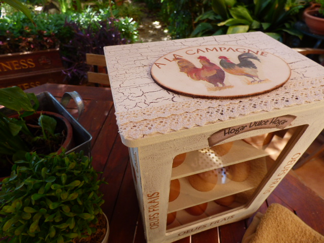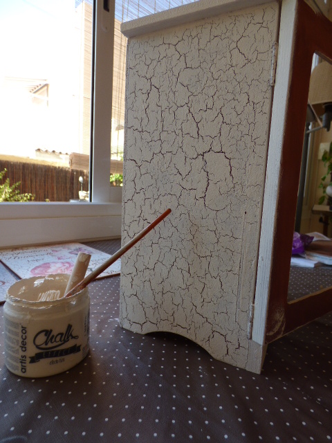 Enseguida me puse manos a la obra. Quería craquelar todos los laterales y la parte superior, asi que fuí haciéndolo a ratos.....capa de una cosa, mientras se hace la comida, capa de otra mientras se acaba una lavadora....así voy siempre, a salto de mata¡