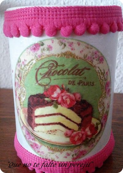 Con varias manos de pintura a la tiza, un motivo del papel de arroz utilizado, unas manos de barniz y un resto de la tira de los borlones, he conseguido este lapicero.