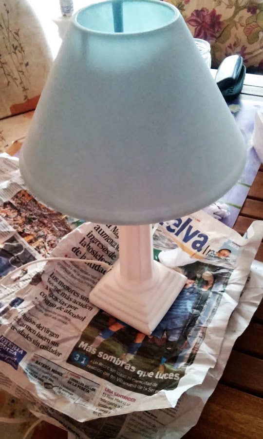 Como el color de mi pantalla era celeste , opté por comprar una de color blanco, no hace falta gastar mucho en ella pues después la vamos a decorar que es lo que pretendemos resaltar. La que compré solo me costó 3 eurillos. En el blanco y colores claros resalta más el decoupage. Así era la pantalla, pero no os preocupéis , no la he tirado pues para otra ocasión me servirá.