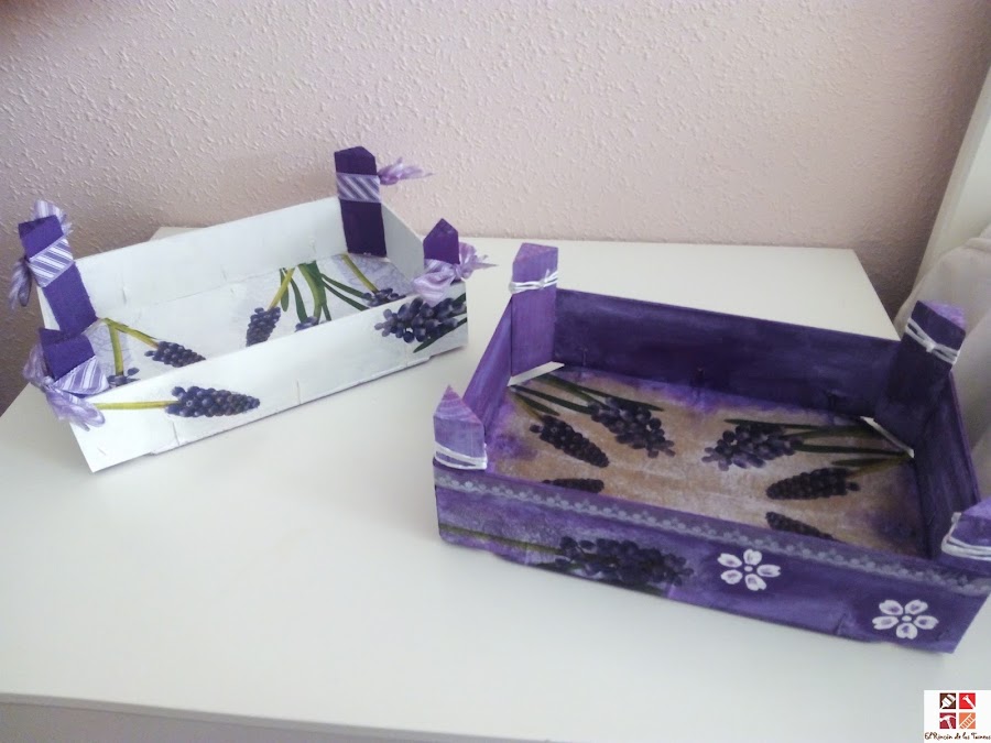 Las pinturas que he usado son acrílicas y el acabado con barniz al agua y decorado con lazos.