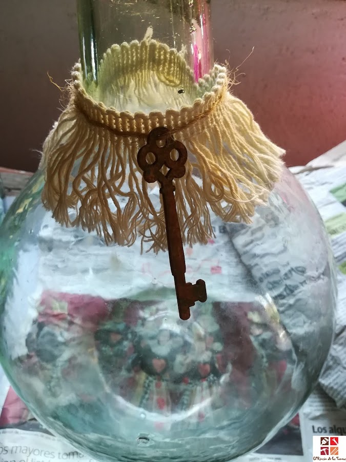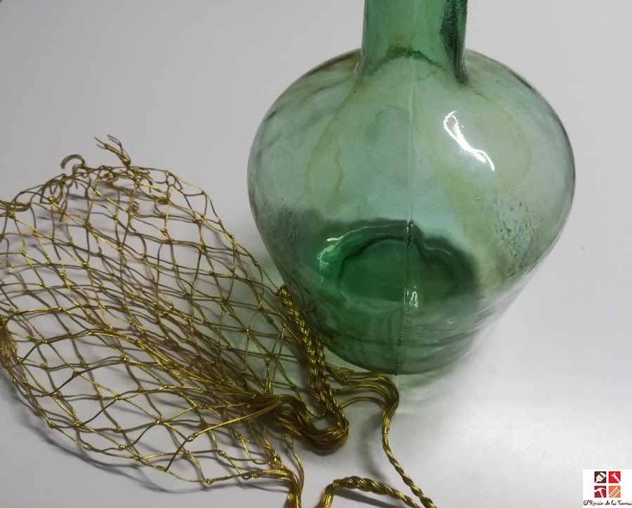 He utilizado una bolsa de red dorada que estaba guardada esperando un tuneo y se me ocurrió envolverla en la damajuana. Así de simple y sencillo pero con un resultado decorativo que me gusta. Que os parece a vosotr@?