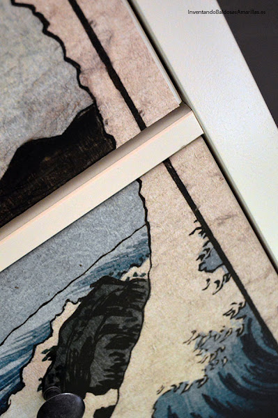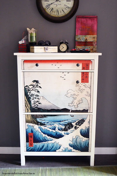 En mi caso, cuando decidí decorar mi zapatero con un vinilo me encontré con que ninguno tenía las dimensiones que estaba buscando. Aunque te lo pueden hacer a medida, pensé que lo mejor era cortarlo para que no se deformara la imagen. Tenía muchas dudas entre "La Gran Ola" de Kanagawa o "Tsunami II" de Hiroshige. Creo que son de esas imágenes que cuando las ves, ya las recuerdas siempre aunque no sepas de quién son, ni dónde las vistes por primera vez.