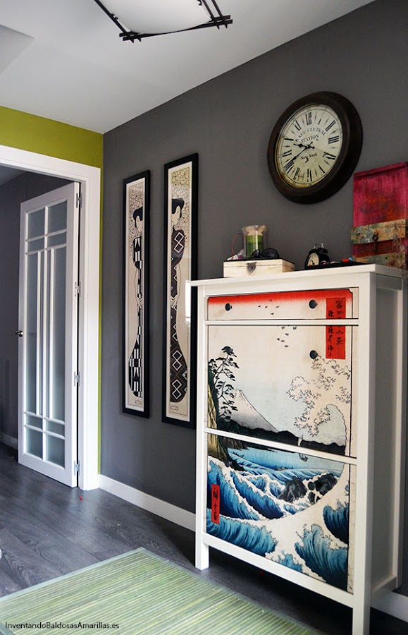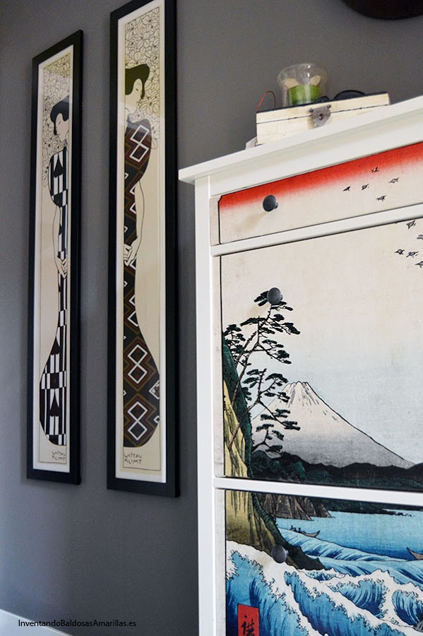 La idea de decorar el zapatero blanco con un vinilo de inspiración japonesa vino un poco marcada por la dos láminas de Gustav Klimt, que están puestas en la pared del al lado. Siempre me gustaron las "Geishas" de Klimt. Posiblemente no sean de sus trabajos más conocidos, pero hace muchos años las vi en un restaurante y siempre he querido tenerlas en casa. Lo que no pega nada es el reloj, que voy a tener que reubicarlos en algún sitio.