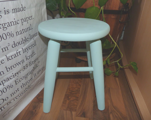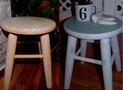 Según el efecto que queramos lograr, podemos saltar los pasos de pintura y adherir el papel directamente sobre la madera de forma que la veta resulte visible a través de él. El resultado final de nuestro taburete es este: