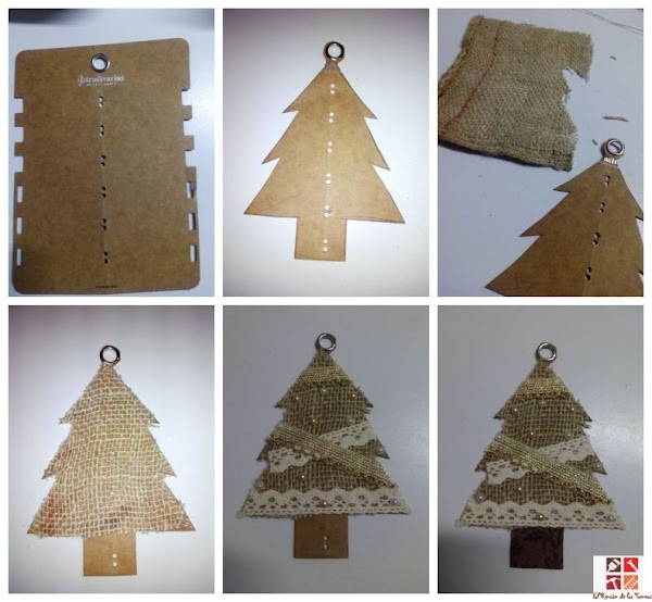 Los pasos ya los veis , recortar el arbol, pegar tela de arpillera y decorar con puntilla y perlas adhesivas, el tronco con decoupage de una servi.