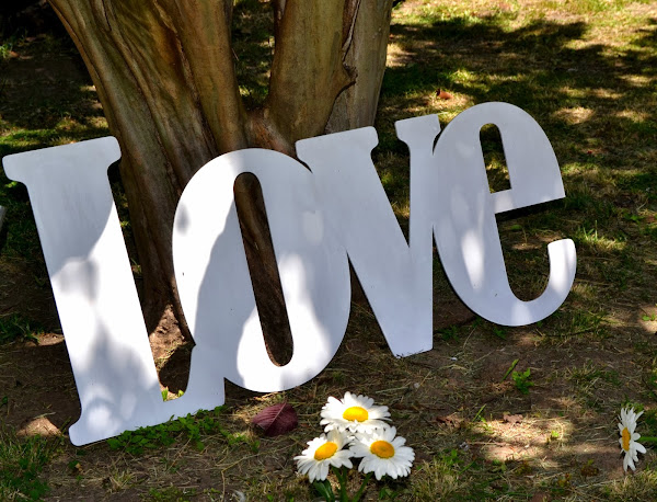 Cartel de love enorme y arboles decorados.