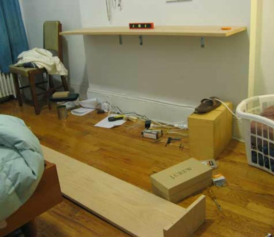 La primera opción, como veis en la imagen superior, es un diseño colgado en la pared, que da la sensación de estar empotrado en la misma. Es un modelo cómodo, de estilo moderno y que ocupa el mínimo espacio.Para fabricarlo han empleado cuatro tablones y unas escuadras. Por un lado han montado la estructura inferior, compuesta por uno de los tablones y los dos laterales, y por otro han colocado la tabla superior en la pared a partir de unas escuadras, de la misma forma que colgaríamos una balda. A continuación, han unido la estructura inferior a la balda y, con eso, ya han finalizado el escritorio, con espacio para guardar las cosas.