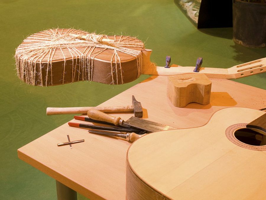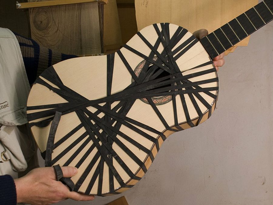 El oficio de la construcción de guitarras está lleno de técnicas y procedimientos singulares, que en bastantes ocasiones son enseñanzas válidas para nuestros diseños. Observemos esta curiosa atadura: es el método clásico para encolar las cuatro delgadas piezas que componen la caja. Podemos aprovechar la idea en el montaje de cualquier armarito.