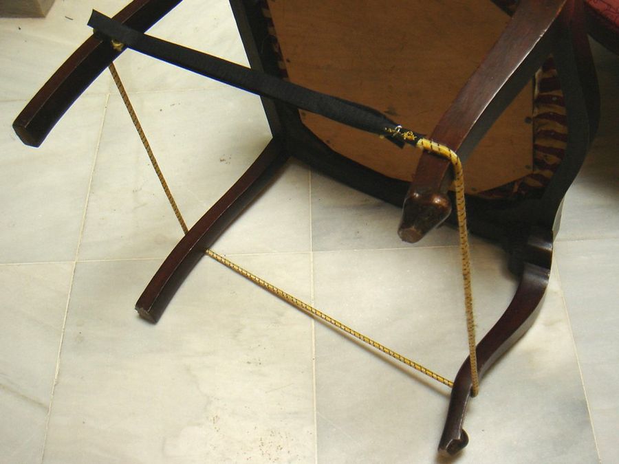 En determinados montajes, no podremos utilizar pinzas ni mordazas, y necesitaremos utensilios específicos. Un caso habitual son las patas de sillas y mesitas. Para afianzarlas mientras el adhesivo endurece, la mejor solución es un tensor elástico casero, de longitud variable, que se ajustará con un velcro.