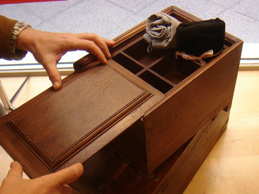 Observemos de qué manera tan sencilla se ha conseguido un cierre de tapa deslizante, en esta bella caja antigua de labores. Ha bastado encolar por el interior de las cuatro paredes unos listoncillos, colocando encima a la distancia precisa unos junquillos por tres lados, dejando el frente abierto.