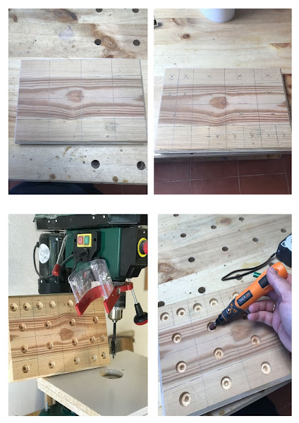 Primero hice varias mediciones en la tabla donde, además de las propias perforaciones del juego, colocaré las diez varillas que hacen de fichas de cada jugador cuando no se este usando. Busco el medio de cada cuadrícula y con el TALADRO DE COLUMNA PARKSIDE y una broca pala de 18 mm voy haciendo las perforaciones sin llegar a traspasar la madera entera, solo lo suficiente como para que la varilla no se caiga cuando se coloque dentro.