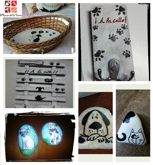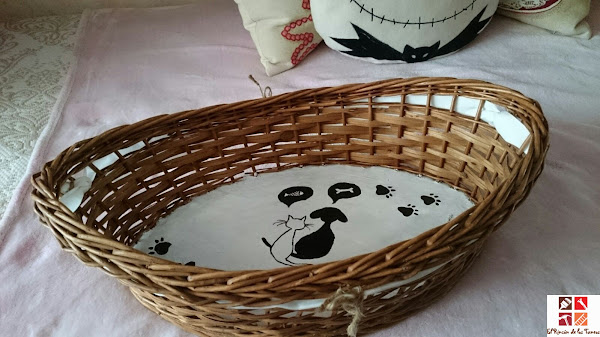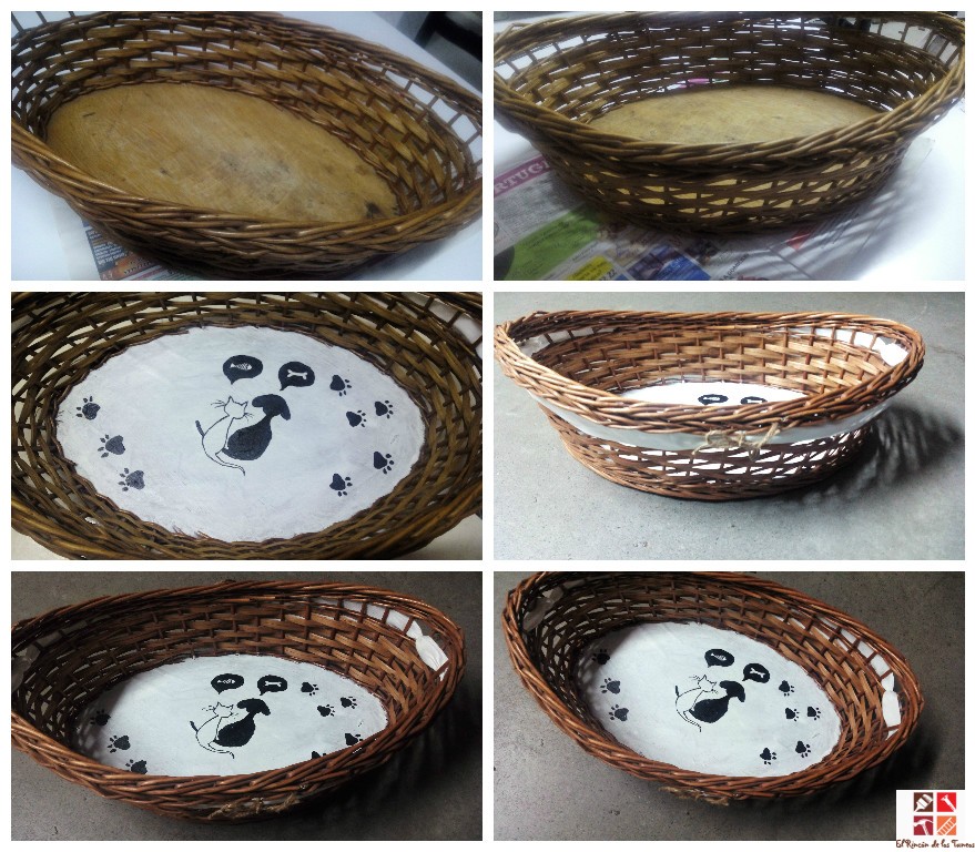 He pintado en el centro y a mano alzada un dibujo de un gato y un perro, he protegido con barniz spray y he adornado con una cinta alrededor.