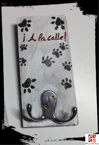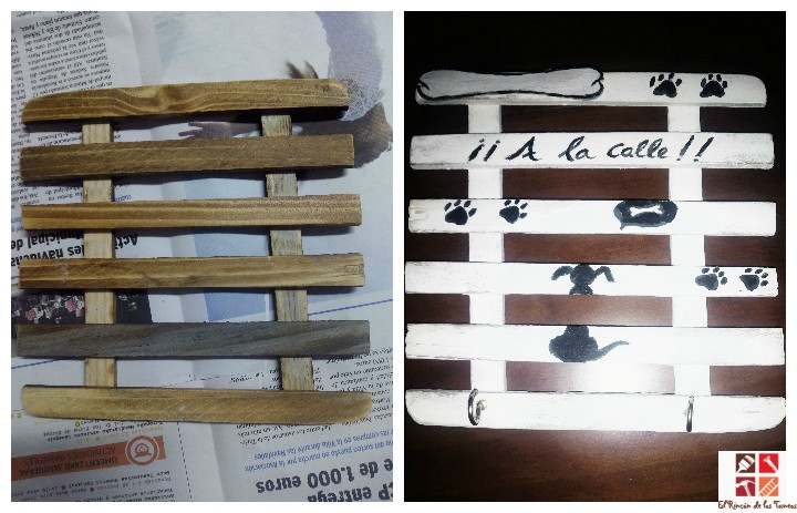Otro colgador hecho con un trozo de tabla o palet, pintado con acrílica gris, he dibujado a mano alzada las huellas y protegido con barniz en spray. Por último he puesto un colgador para las correas.