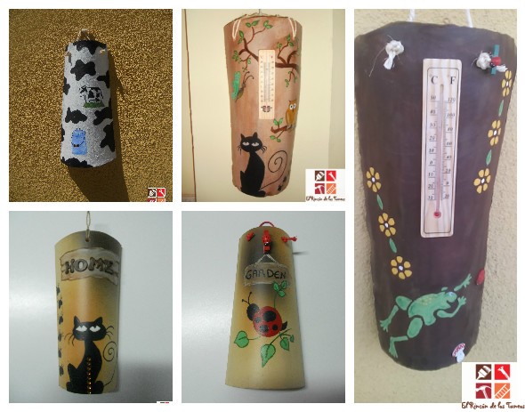 Algunas propuestas de mis tejas , todas con motivos de animales y pintadas a mano alzada con acrílicas y barniz mate al agua para proteger. Decoradas con varios elementos como termómetros y otras piezas decorativas.