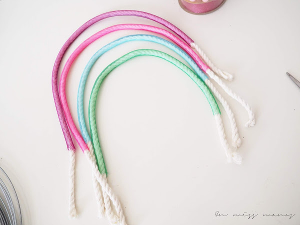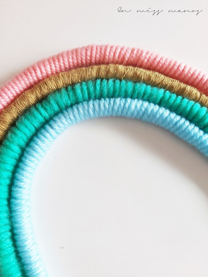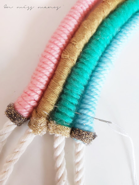 En los extremos pegué un trozo de lana dorada, y uní los cuatro arcos cosiéndolos haciendo un zig zag por todo el arcoiris.