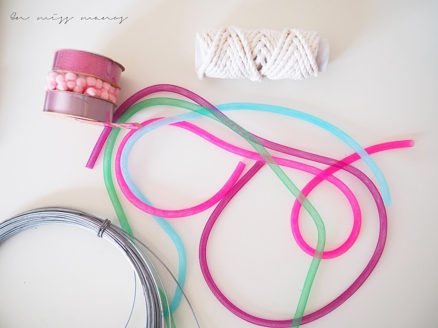 Yo en mi versión utilicé cuerda de algodón, alambre, unos tubos huecos que tenía de hacer bisutería, lana y mini pompones.