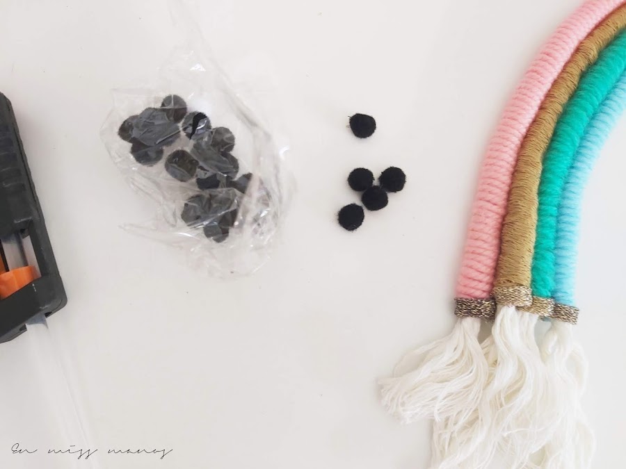 Para dar el toque final pegué en todo alrededor mini pompones negros con pegamento caliente.