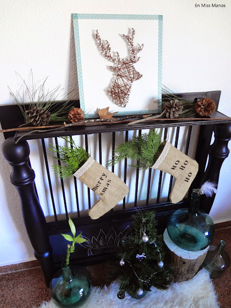 Como se ve en las imágenes he cambiado un poquito la deco de la chimenea, añadiendo piñas, hojas de pino, ramas...y colocado el reno en la parte central, para adaptarla a estas fechas de la forma más natural posible. Las damajuanas con el tronco he decidido dejarlas ahí porque se adaptan perfectamente al conjunto ¿no creéis?