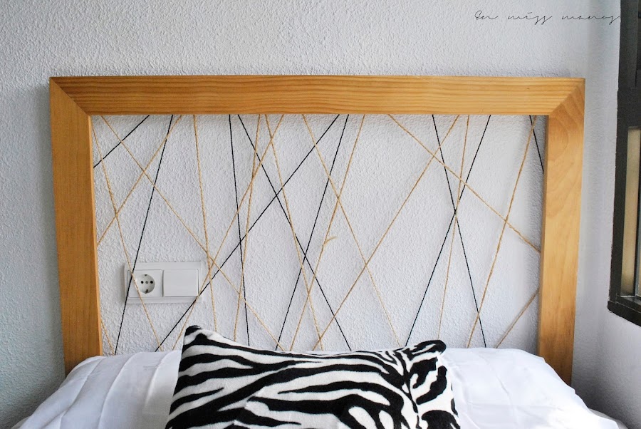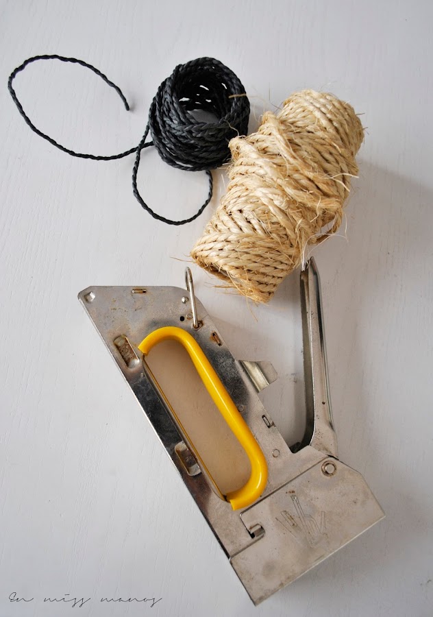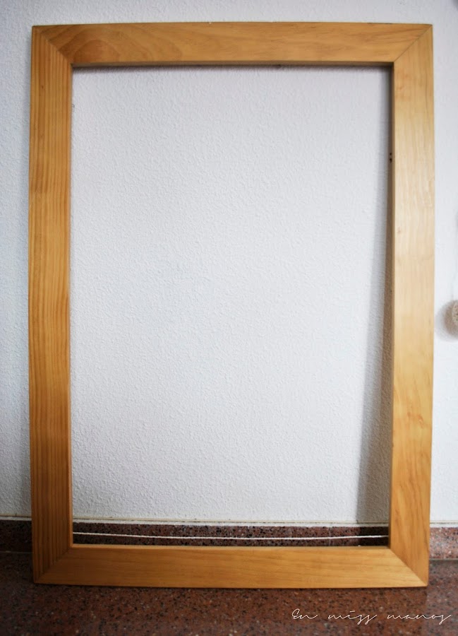Sólo hace falta un marco grande, que incluso se puede fabricar con unos listones, y cuerda, que en mi caso fue de sisal y de papel en color negro.