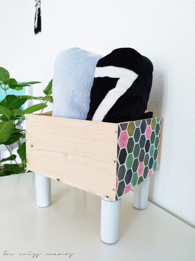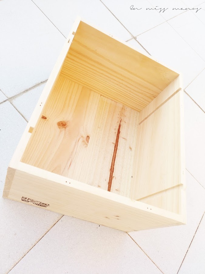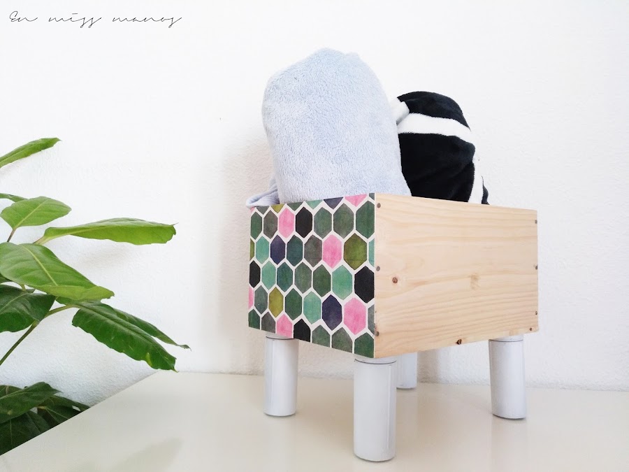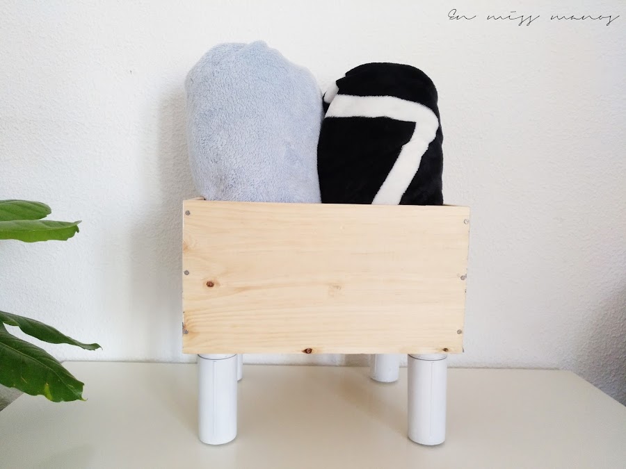 La caja la cogí del sitio donde trabajaba, era una caja de vino perfecta, con una altura ideal para guardar cosas, así que... aproveché que dos días antes había quitado la escalera del salón donde colocaba las mantas para darle ese uso.
