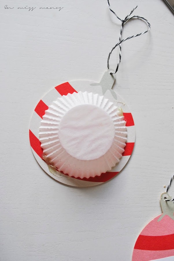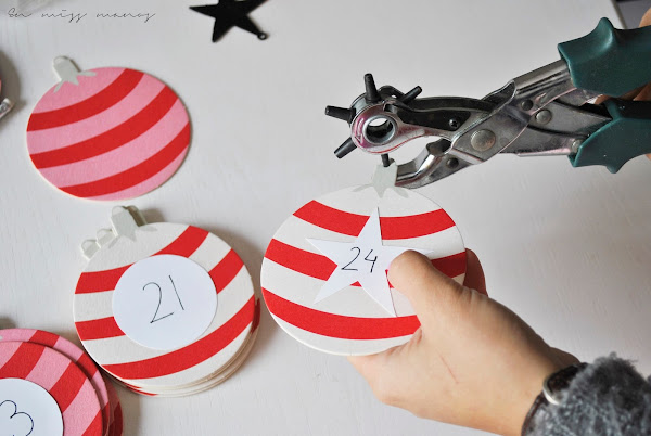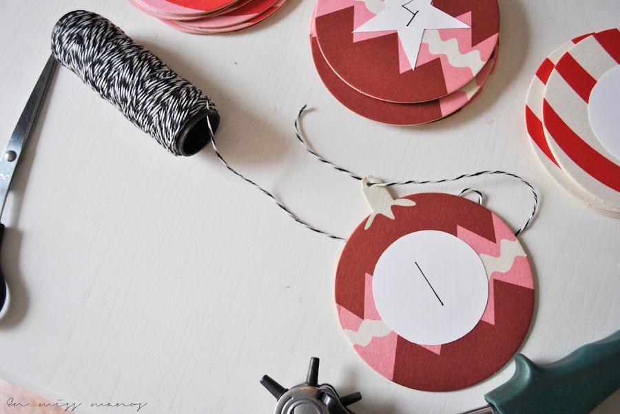 En las marcas donde irían los agujeros de las bolas navideñas, utilicé un sacabocados para pasar el hilo, ya que iban colgados en el árbol de palé que hice hace unos años.
