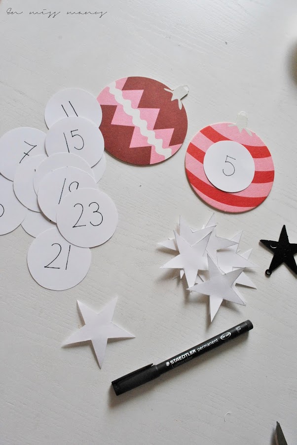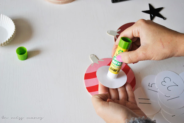 Aunque venían cinco modelos diferentes, elegí estos tres, y para escribir los números hice con cartulina blanca doce circunferencias y doce estrellas.